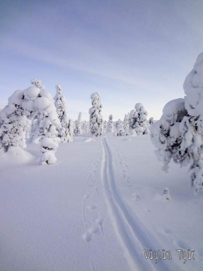 Alkuperäinen suunnitelmahan oli, että oltaisiin Kesänginjärven rannalta kiikuttu Kesänkitunturin laitaa pitkin tunturin toiselle puolelle ja sieltä lähteneet nousemaan Lainiotunturia pitkin. Ei taaskaan menny ihan suunnitelmien mukaan. Ehkä sitä näiden reissujen myötä oppisi oikein suunnittelemaan lumikenkäreitit ja oikein arvioimaan aikaa kuinka kauan menisi. Paikoittain Kesänkitunturin kylki oli kovaksi pakkautunutta lunta tai valmiita jälkiä oli niin paljon ettei kulkemisessa ollut mitään ongelmaa. Sitten taas oli kohtia ettei jälkiä ollut ollenkaan ja lumi oli niin pehmeää, että joka askeleella jalka upposi lumeen melkein polveen saakka. Miten näitä nyt osaisi tietää ja noista tehä arviot?